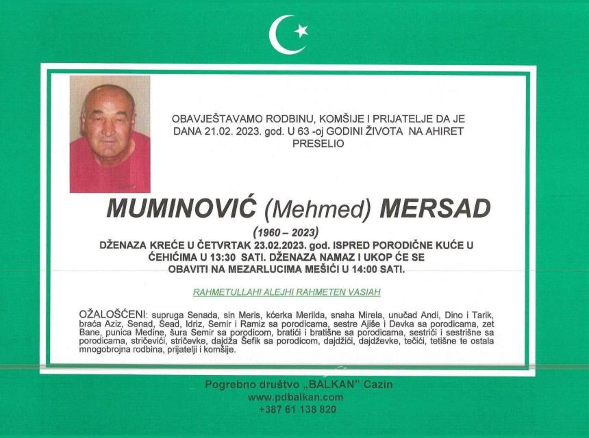 Tužnog srca i s bolom u duši obavještavamo rodbinu, komšije i prijatelje da je naš dragi Muminović (Mehmed) Mersad, dana 2102.2023 godine na ahiret preselio u 63-oj godini života.