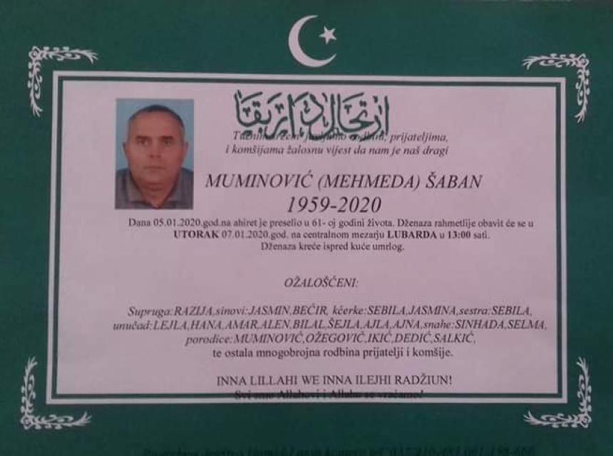 Tužnim srcem i bolom u duši javljamo rodbini, komšijama i prijateljima da je dana 05.01.2020. godine u 61. godini života na Ahiret preselio Muminović (Mehmeda) Šaban.