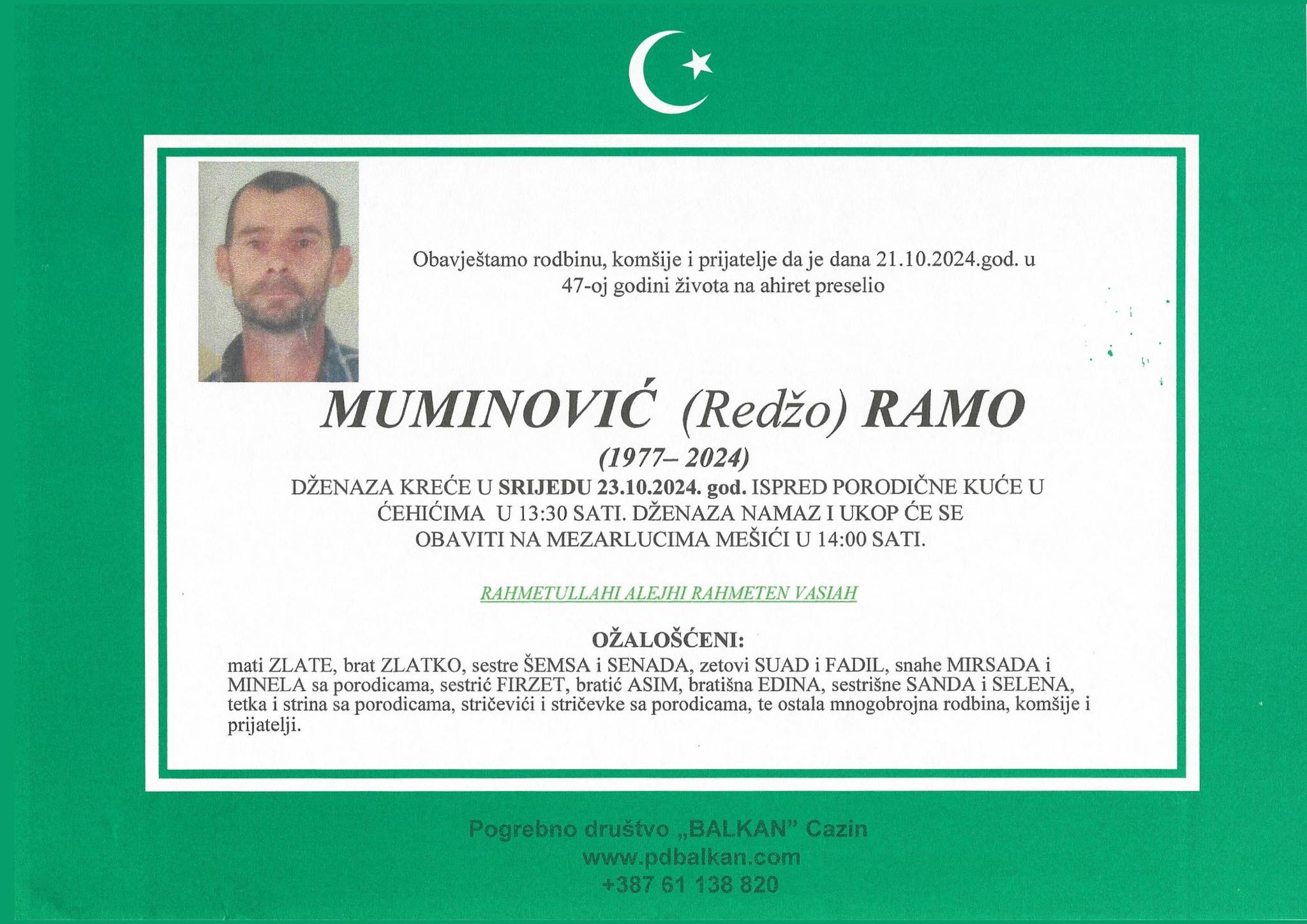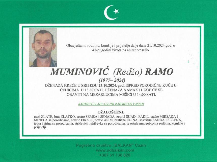 Obavještavamo rodbinu i prijatelje da je 21.10.2024. godine na ahiret u 47. godini života preselio Muminović (Redžo) Ramo.