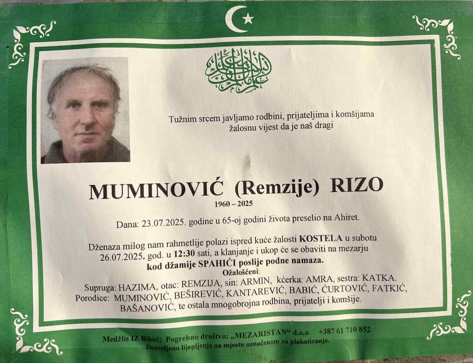 26.07.2025. god. u 12:30 sati, a klanjanje i ukop će se obaviti na mezarju