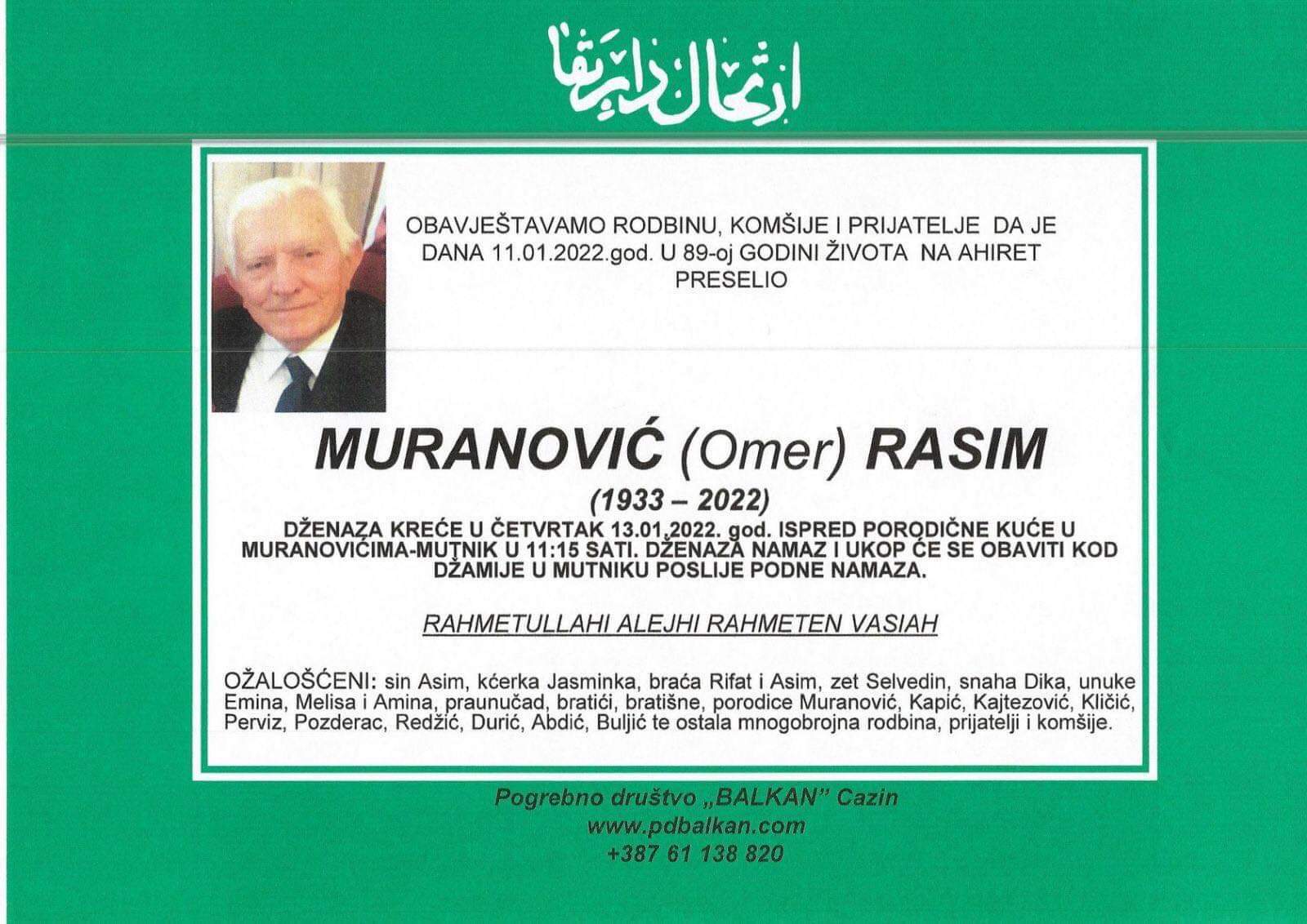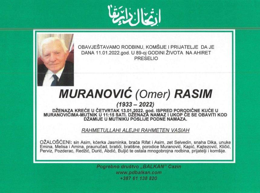Tužnog srca i s bolom u duši obavještavamo rodbinu, komšije i prijatelje da je naš dragi Muranović (Omer) Rasim 11.1.2022. u 89. godini života preselio na ahiret.