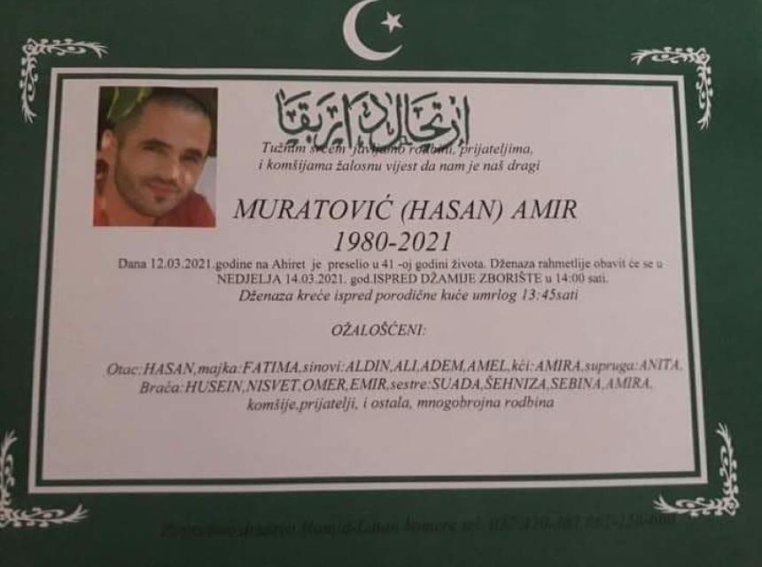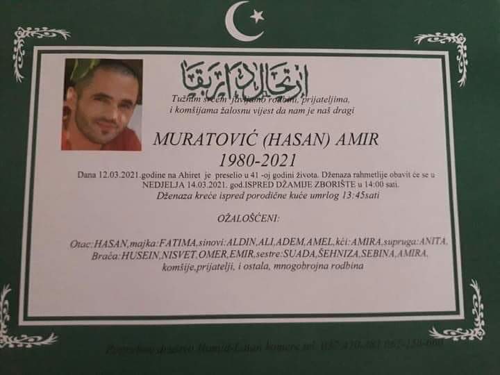 Tužnog srca i s bolom u duši obavještavamo rodbinu, komšije i prijatelje da je naš dragi Muratović (Hasan) Amir, dana 12.03.2021 godine, u 41-oj godini života, preselio na Ahiret.