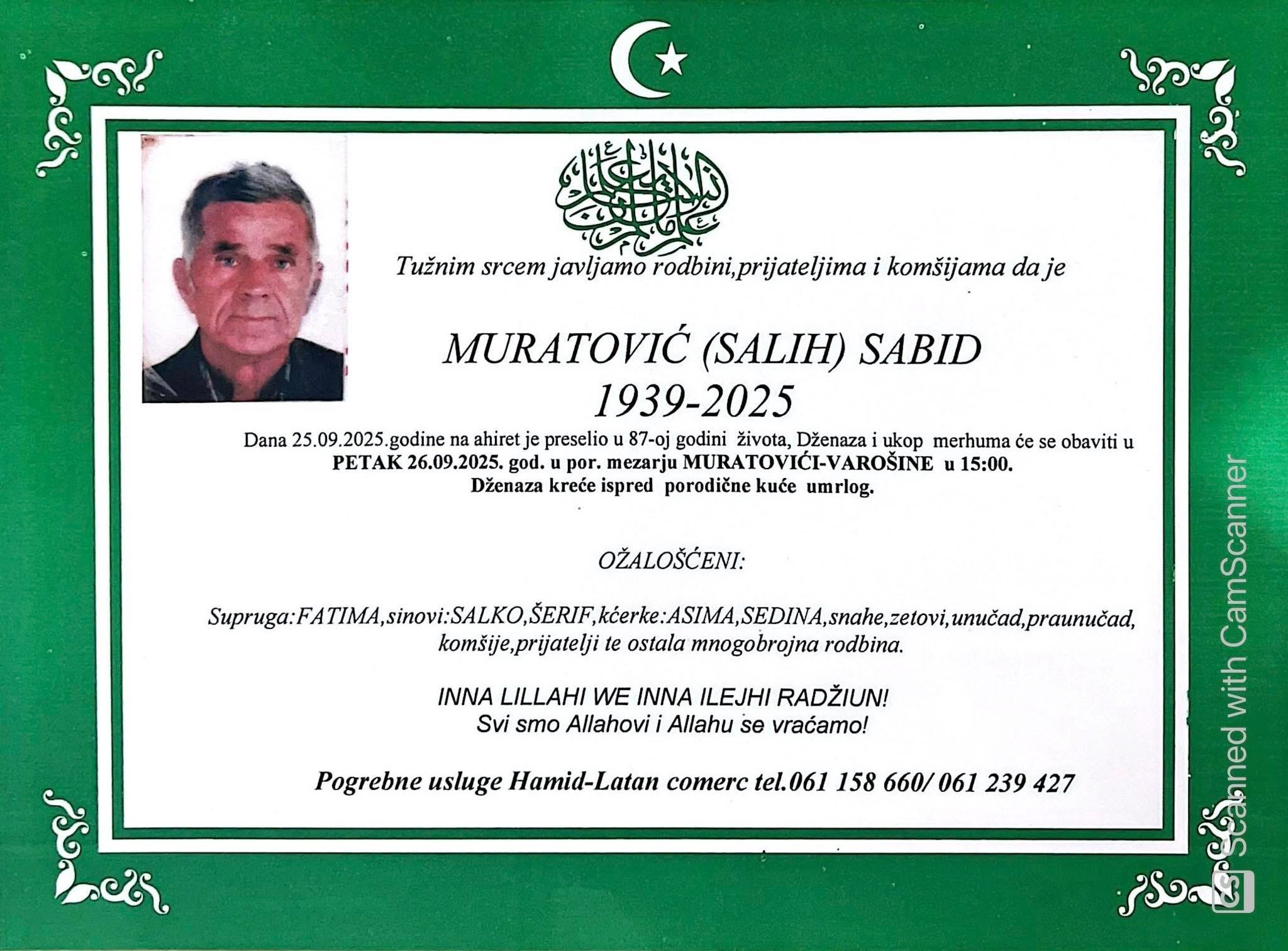 Dženaza i ukop merhuma obavit će se u petak, 26.09.2025. godine, u porodičnom mezarju Muratovići-Varošine u 15:00 sati.