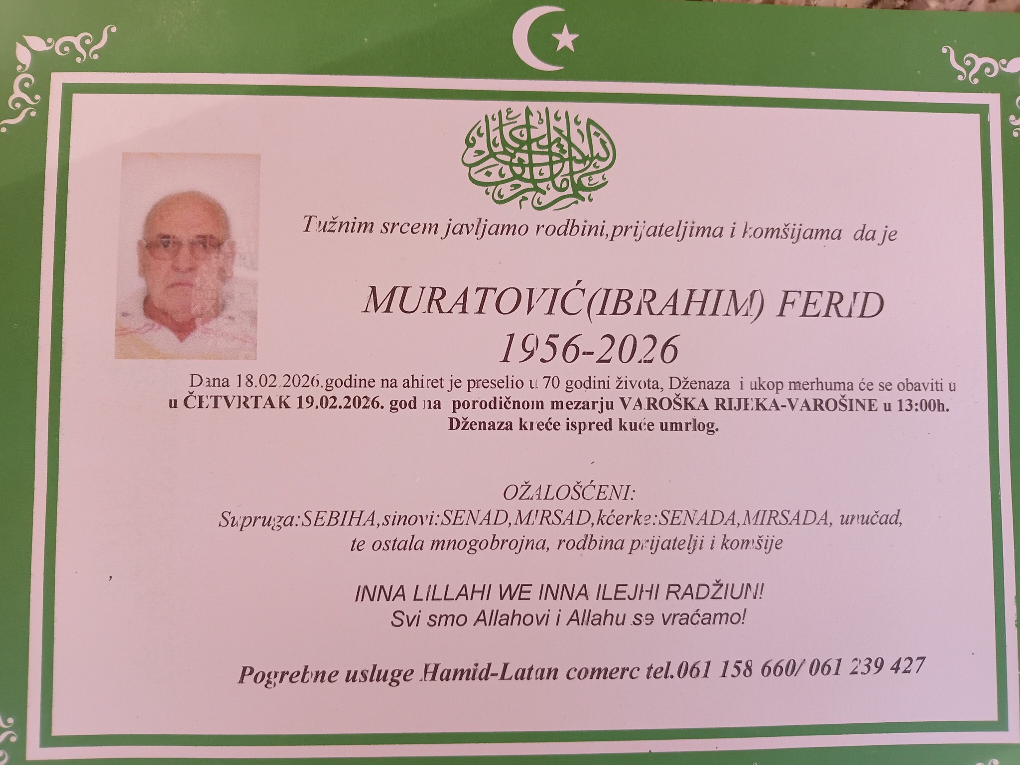 Dženaza i ukop merhuma će se obaviti u u ČETVRTAK 19.02.2026. god na porodičnom mezarju VAROŠKA RIJEKA-VAROŠINE u 13:00h.