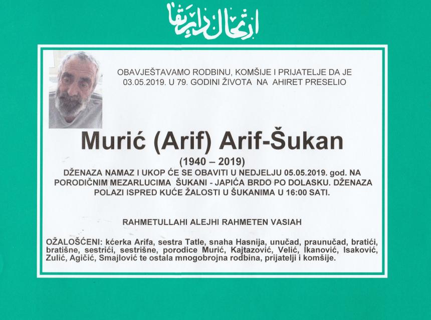 Tužnim srcem i bolom u duši javljamo rodbini, prijateljima, komšijama i poznanicima da je dana 03.05.2019. godine u 79.-oj godini života na Ahiret preselio naš dragi Murić (Arif) Arif-Šukan.