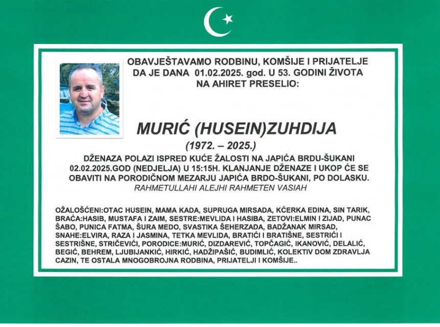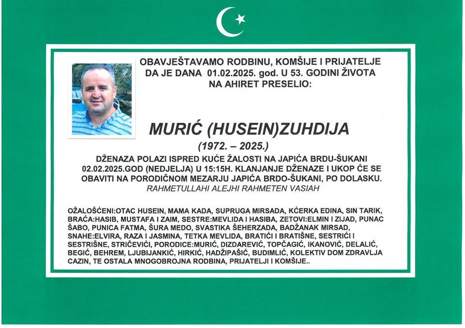 Duboko ožalošćeni obavještavamo rodbinu, prijatelje i komšije da je dana 01.02.2025. god. u 53-oj godini života na ahiret preselio Murić (Husein) Zuhdija.