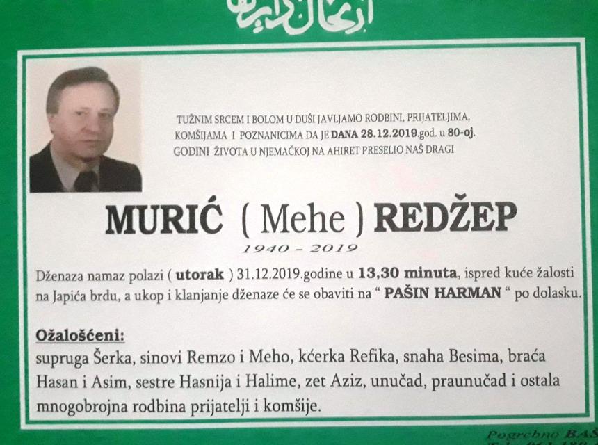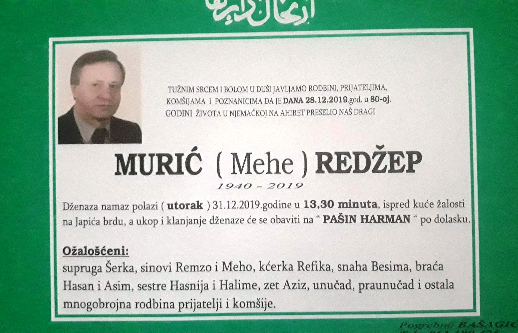 Tužnim srcem i bolom u duši javljamo rodbini i prijateljima da je dana 28.12.2019. godine u 80-oj godini života, na Ahiret preselio Murić (Mehe) Redžep.