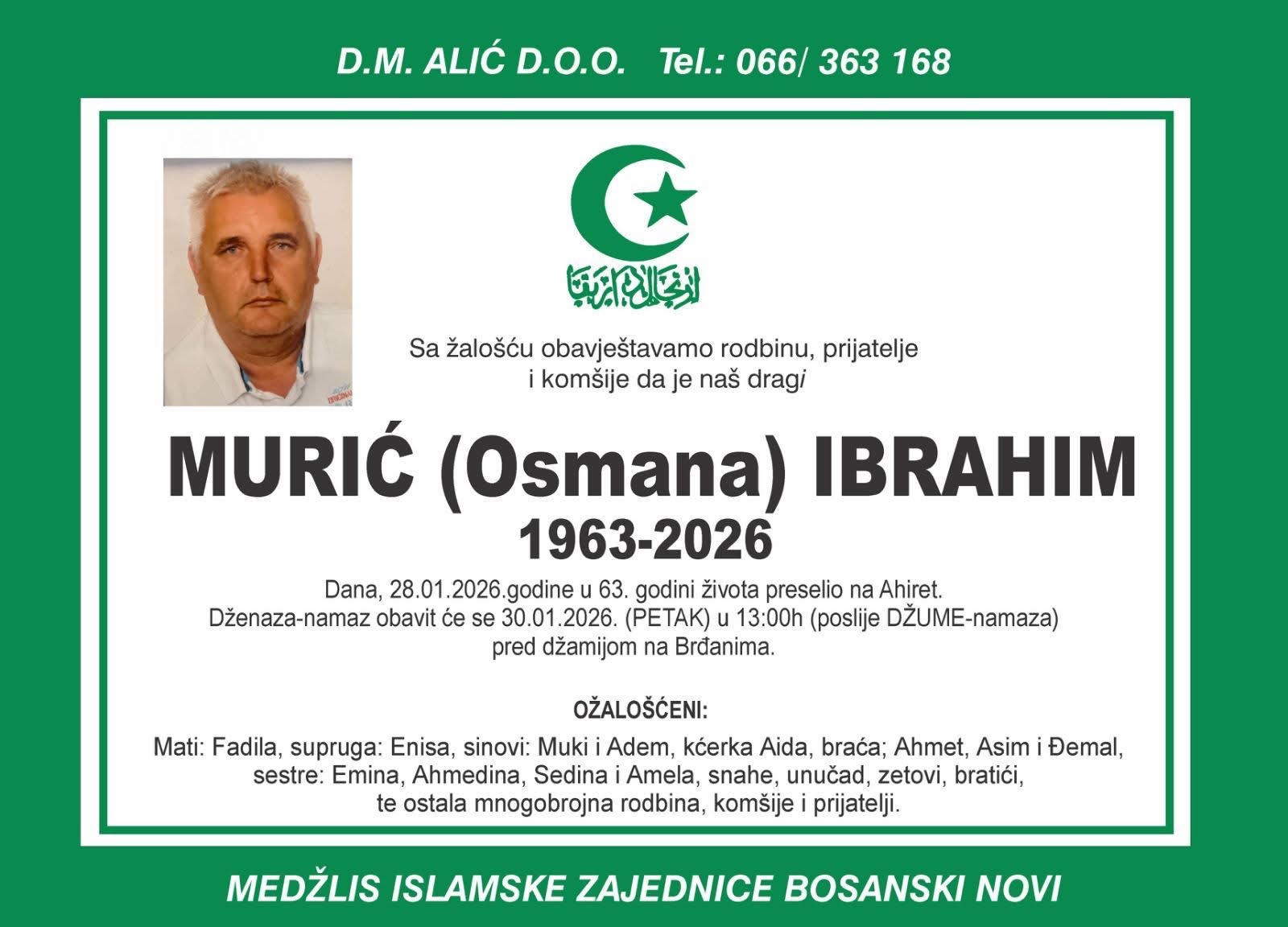 Dženaza-namaz obavit će se 30.01.2026. (petak) u 13:00 h (poslije džuma-namaza) pred džamijom na Brdanima.