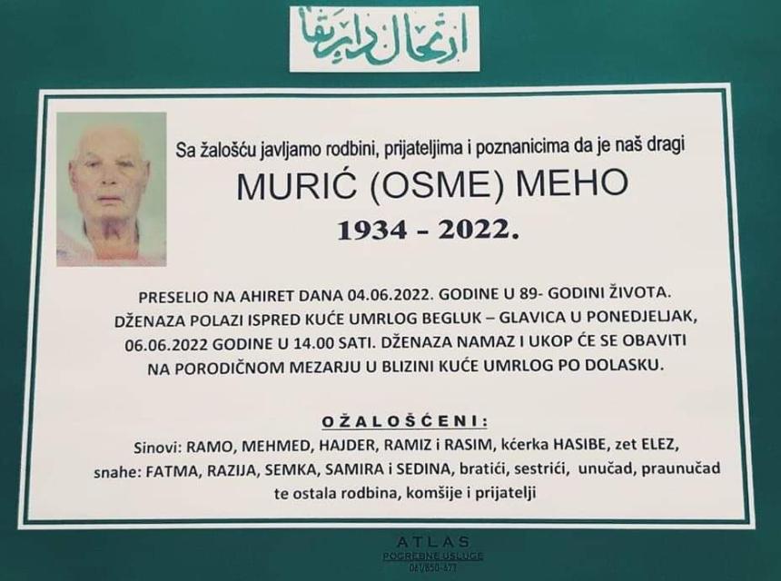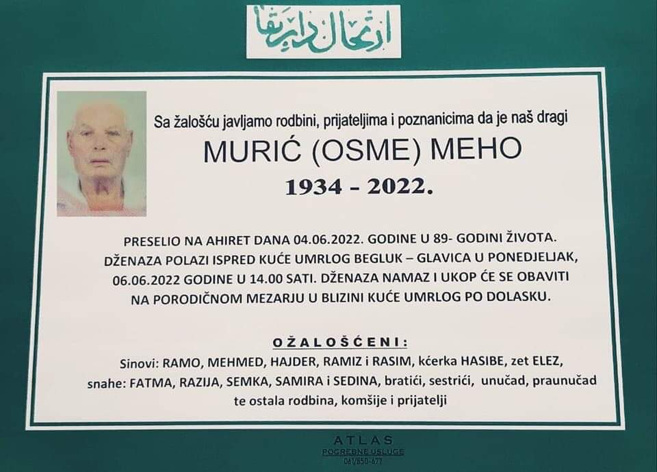 Tužnog srca i s bolom u duši obavještavamo rodbinu, komšije i prijatelje da je naš dragi Murić (Osme) Meho u 89. godini života preselio na Ahiret.