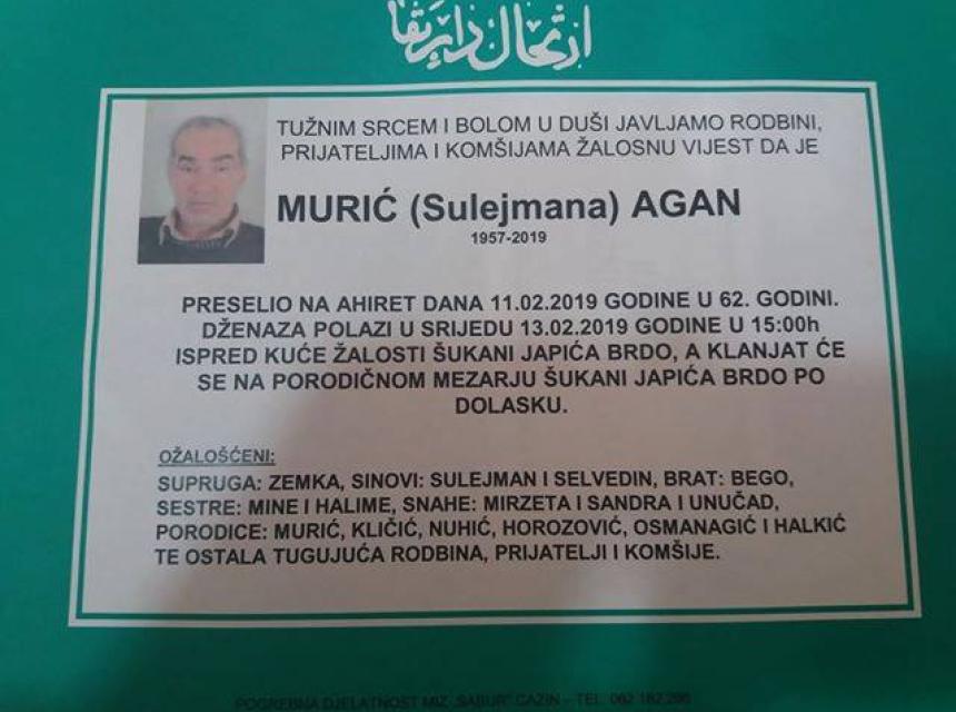 Tužnim srcem i bolom u duši javljamo rodbini, prijateljima i komšijama žalosnu vijest da je dana 11.02.2019.g. u 62.-oj godini života na Ahiret preselio Murić (Sulejmana) Agan.