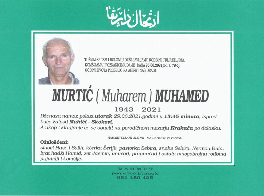 Tužnog srca i s bolom u duši obavještavamo rodbinu, komšije i prijatelje da je naš dragi Murtić (Muharem) Muhamed, dana 25.06.2021. godine, u 79-oj godini života, preselio na ahiret.