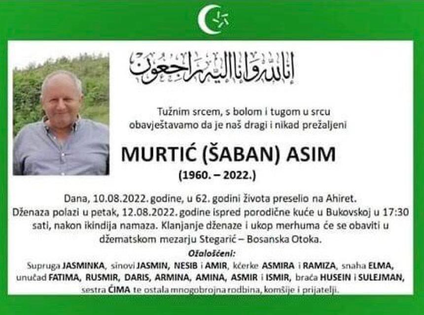 Tužnog srca i s bolom u duši obavještavamo rodbinu, komšije i prijatelje da je naš dragi Murtić (Šaban) Asim dana 10.08.2022.god u 62. godini života preselio na Ahiret.