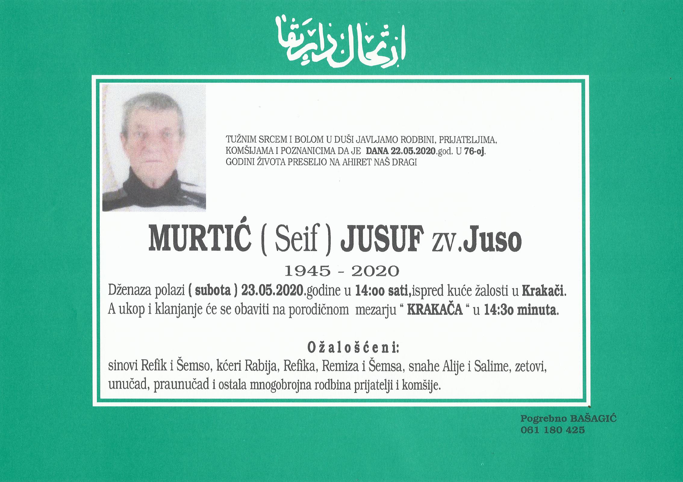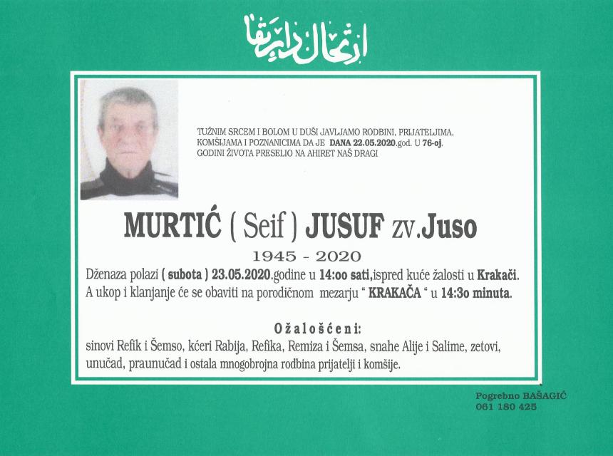 Teškim srcem i bolom u duši javljamo da je naš dragi i nikad prežaljeni Murtić (Seif) Jusuf zv. Juso dana 22.05.2020.godine u 76-toj godini života preselio na Ahiret.