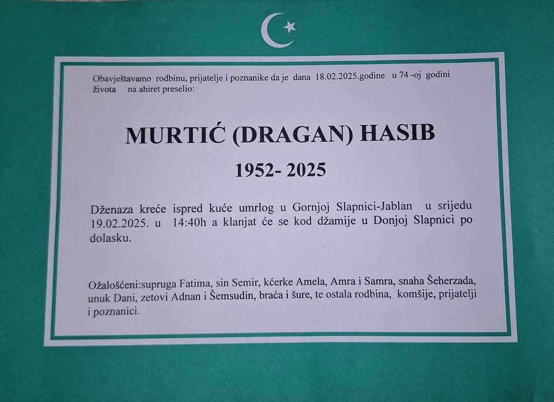 Dženaza kreće ispred kuće umrlog u Gornjoj Slapnici-Jablan u srijedu 19.02.2025. u 14:40h a klanjat će se kod džamije u Donjoj Slapnici po dolasku.