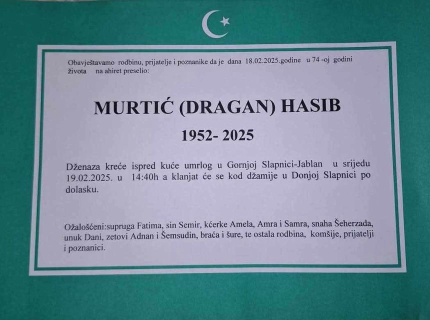 Obavještavamo rodbinu, prijatelje i poznanike da je dana 18.02.2025.godine u 74-toj godini života na ahiret preselio Murtić(Dragan)Hasib.