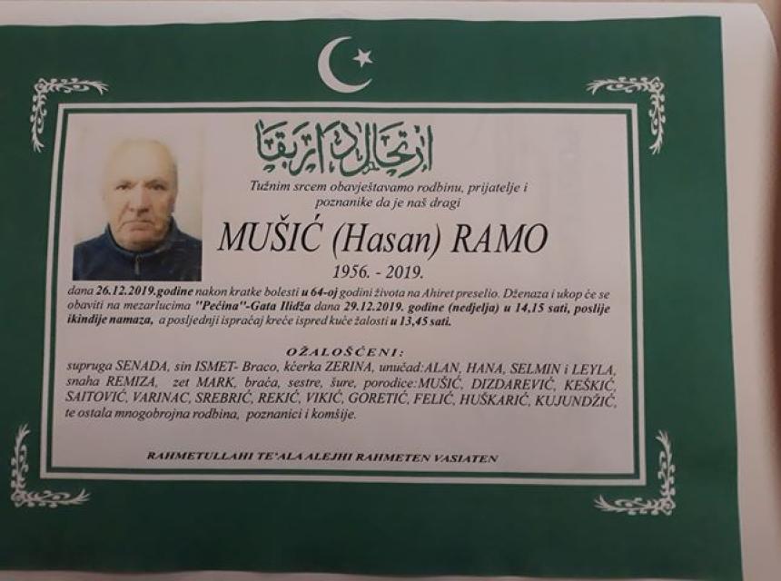 Tužni srcem obaviještavamo rodbinu, prijatelje i poznanike da je naš dragi Mušić (Hasan) Ramo dana 26.12.2019. godine nakon krate bolseti u 64-oj godini života na Ahiret preslio. Dženaza i ukop će se obavitina mezarlucima "Pećina" Gata- Ilidža dana 29.12.2019.godine (nedjelja) u 14:15 sati, poslije ikindije namaza, a posljednji ispraćaj kreće ispred kuće žalosti u 15:45 sati.
