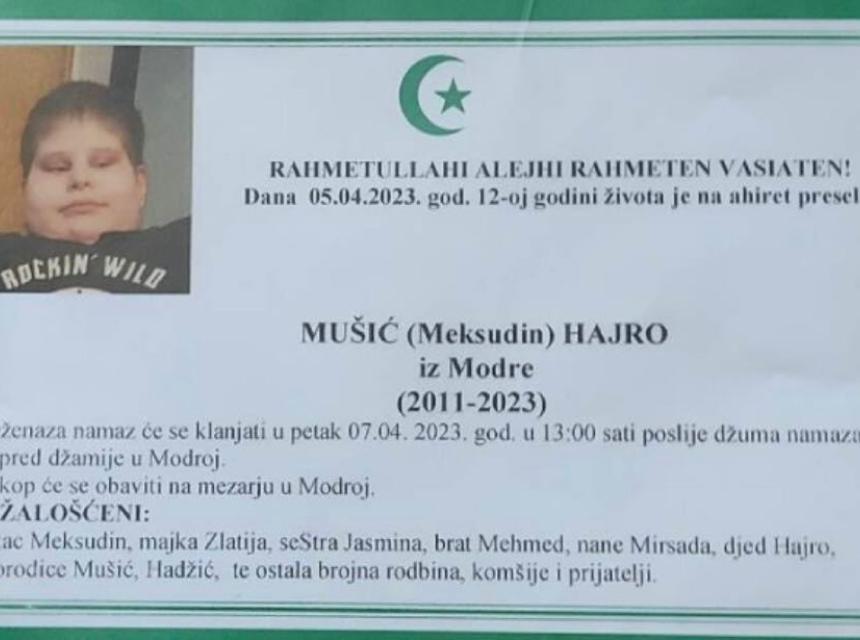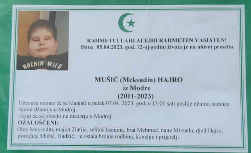 Tužnim srcem javljamo rodbini, prijateljima i poznanicima tužnu vijest da nam je naš dragi Mušić (Meksudin) Hajro na Ahiret preselio dana 05.04.2023. godine u 12-oj godini.