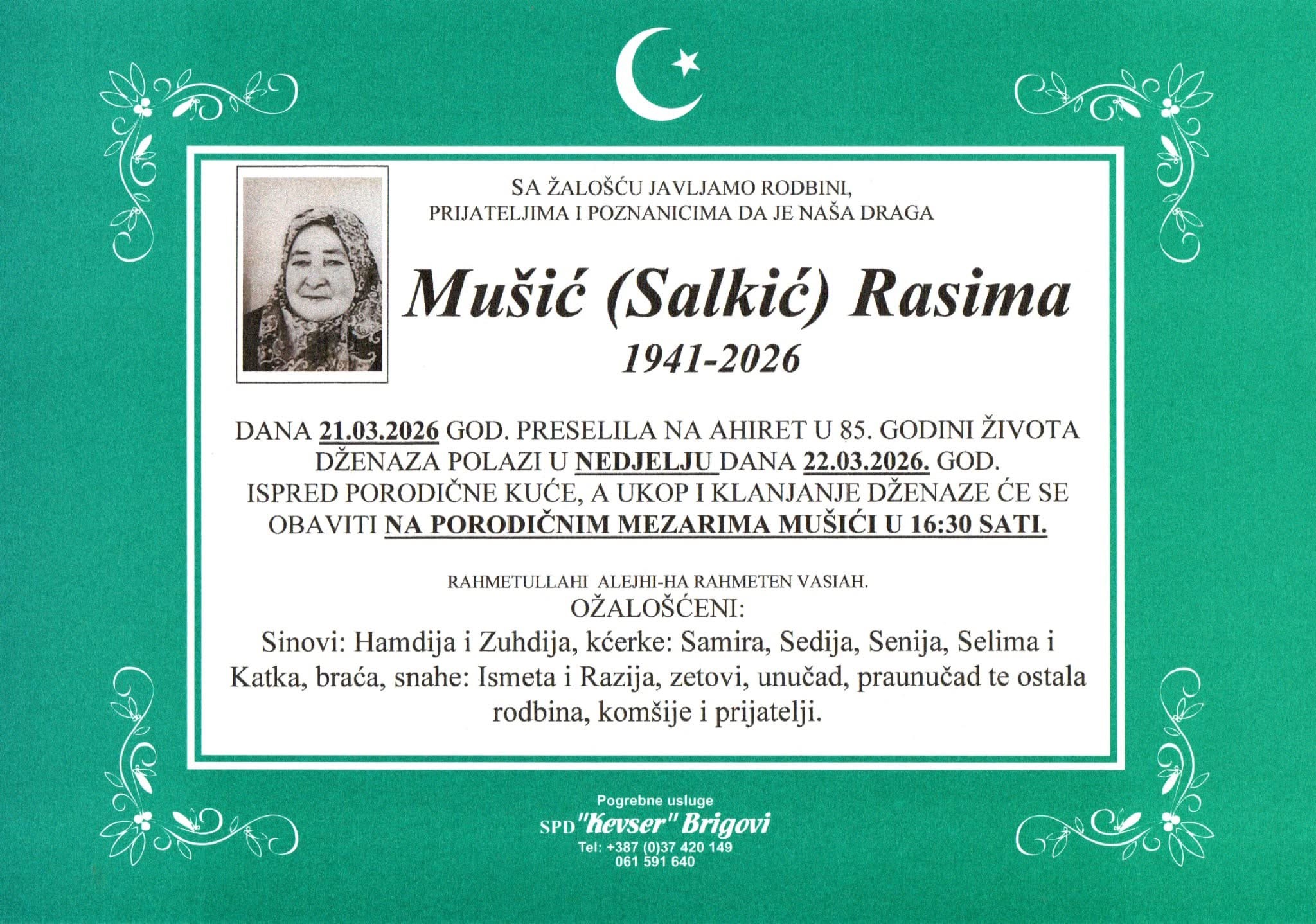 Dženaza polazi u nedjelju, dana 22.03.2026. godine, ispred porodične kuće, a ukop i klanjanje dženaze će se obaviti na porodičnim mezarima Mušići u 16:30 sati.