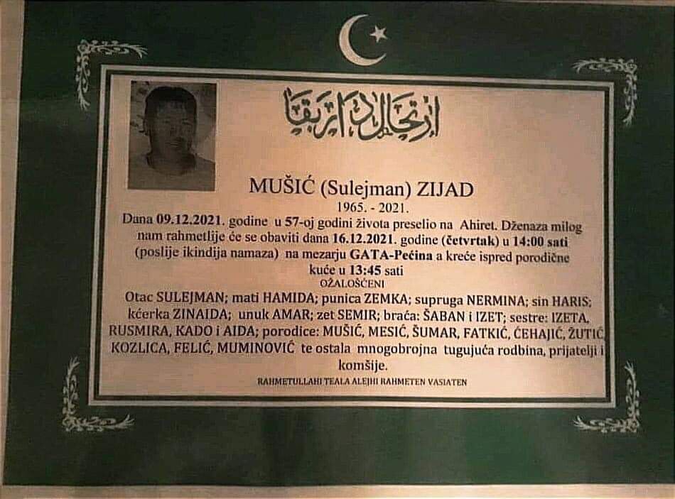 Tužnog srca i s bolom u duši obavještavamo rodbinu, komšije i prijatelje da je naš dragi Mušić (Sulejman) Zijad, dana 09.12.2021. godine, u 57-oj godini života preselio na Ahiret.