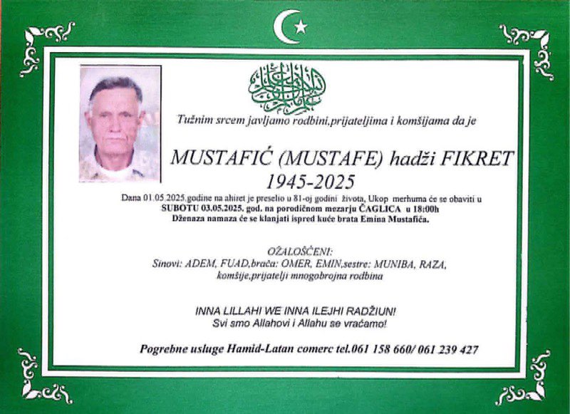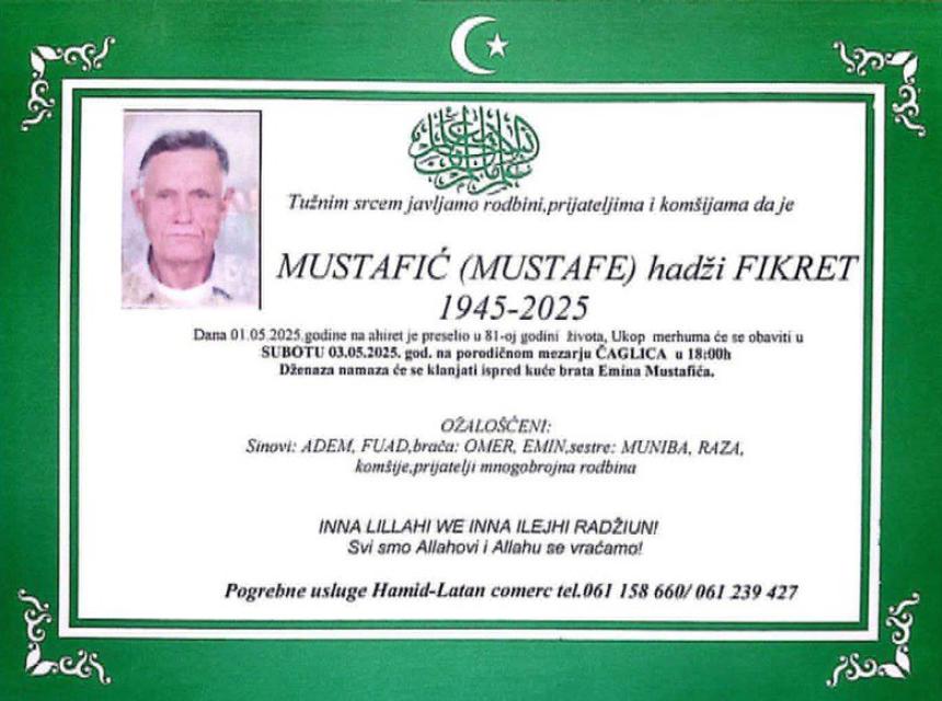 Tužnim srcem i bolom u duši javljamo rodbini, prijateljima i komšijama da je naš dragi MUSTAFIĆ (Mustafe) hadži FIKRET, dana 01.05.2025. godine u 81-oj godini života, preselio na ahiret.