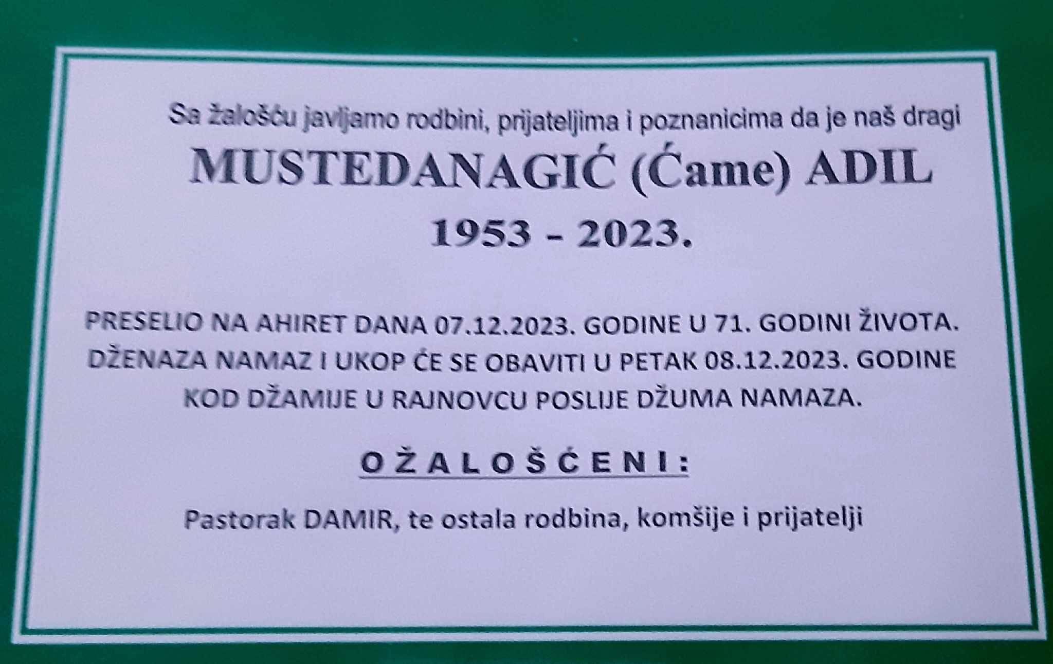 TUŽNIM SRCEM I BOLOM U DUŠI JAVLJAMO RODBINI, PRIJATELJIMA I POZNANICIMA DA JE NAŠ DRAGI Mustedanagić (Ćame) Adil , dana 07.12.2023. godine, a u 71-oj godini preselio na ahiret.