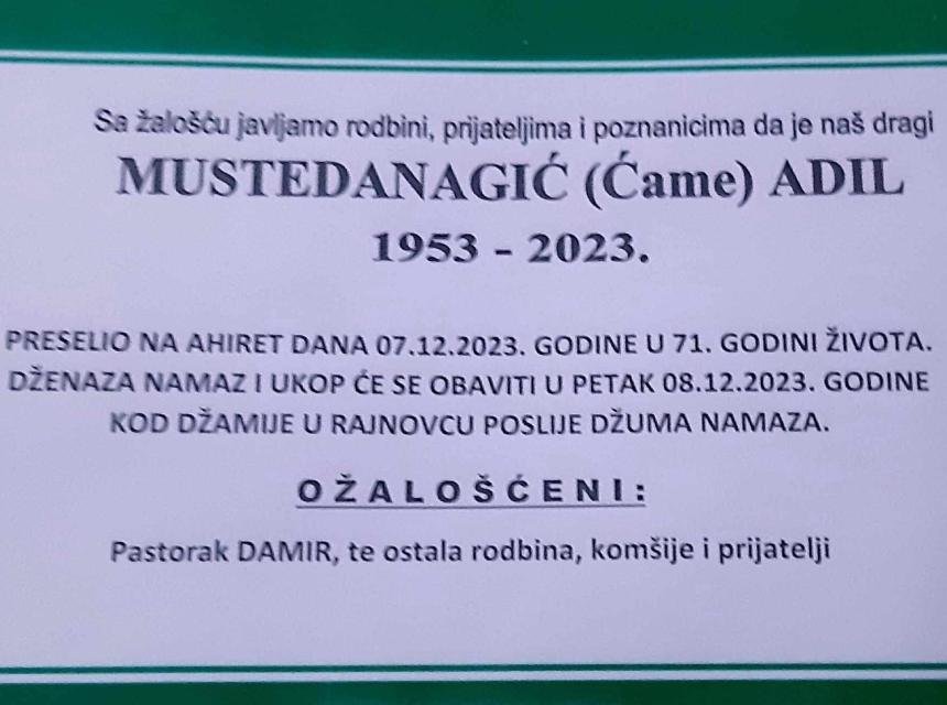 Dženaza namaz i ukop će se obaviti dana 08.12.2023. godine (petak) kod džamije u Rajnovcu poslije džuma namaza.