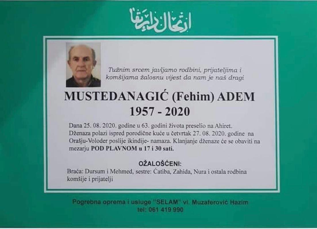 Tužnog srca i sbolom u duši obavještavamo rodbinu, komšije i prijatelje da je naš dragi Mustedanagić (Fehim) Adem preselio na Ahiret, dana 25. avgusta 2020. godine, u 63. godini života.