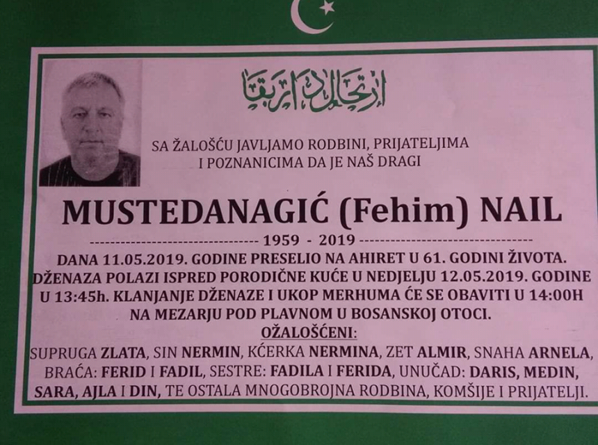 Tužnim srcem i bolom u duši javljamo rodbini, prijateljima i poznanicima da je naš dragiMustedanagić (Fehim) Nail dana 11.05.2019.godine. u 61- oj godini preselio na Ahiret.