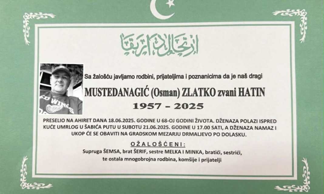 Dženaza polazi ispred kuće umrlog u Šabića putu u subotu 21.06.2025. godine u 17:00 sati, a dženaza namaz i ukop će se obaviti na gradskom mezarju Drmaljevo po dolasku.