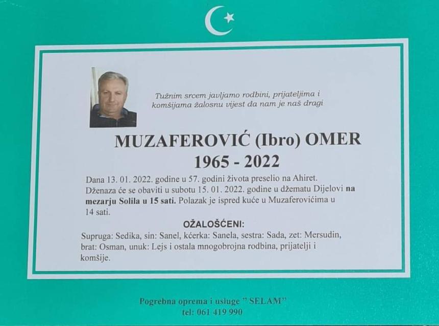 Tužnog srca i s bolom u duši obavještavamo rodbinu, komšije i prijatelje da je naš dragi Muzaferović (Ibro) Omer 13.1.2022. u 57. godini života preselio na ahiret.