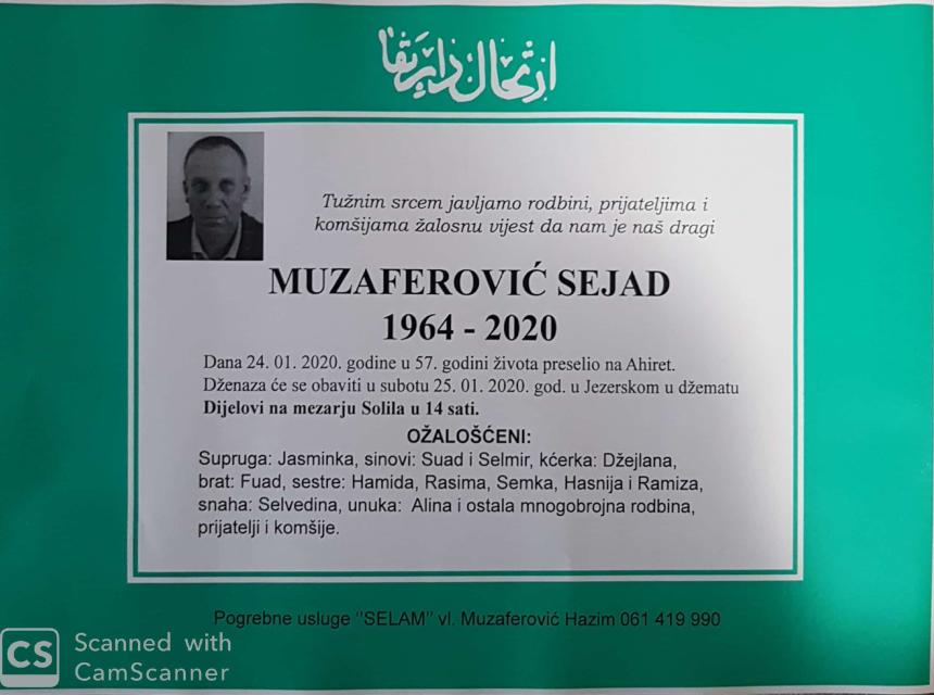 Tužnim srcem i bolom u duši javljamo rodbini i prijateljima da je naš dragi Muzaferović Sejad dana 24.01.2020. godine preselio na Ahiret.