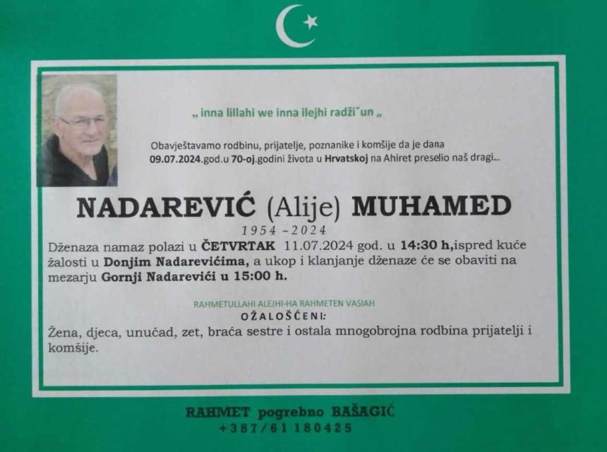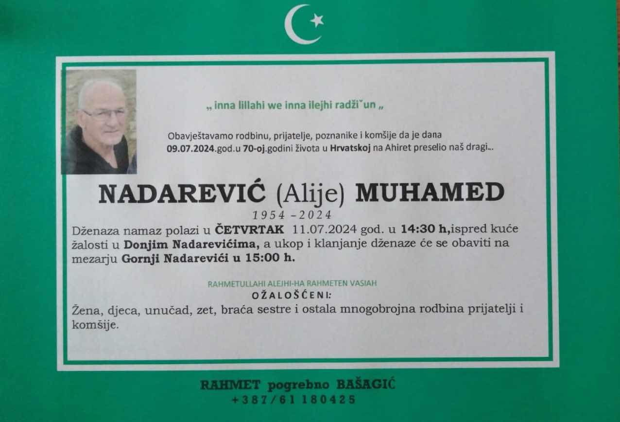 Dženaza polazi u četvrtak 11.07.2024. godine u 14:30h, ispred kuće žalosti u DONJIM NADAREVIĆIMA, a ukop i klanjanje će se obaviti na mezarju Gornji Nadarevići u 15:00h.
