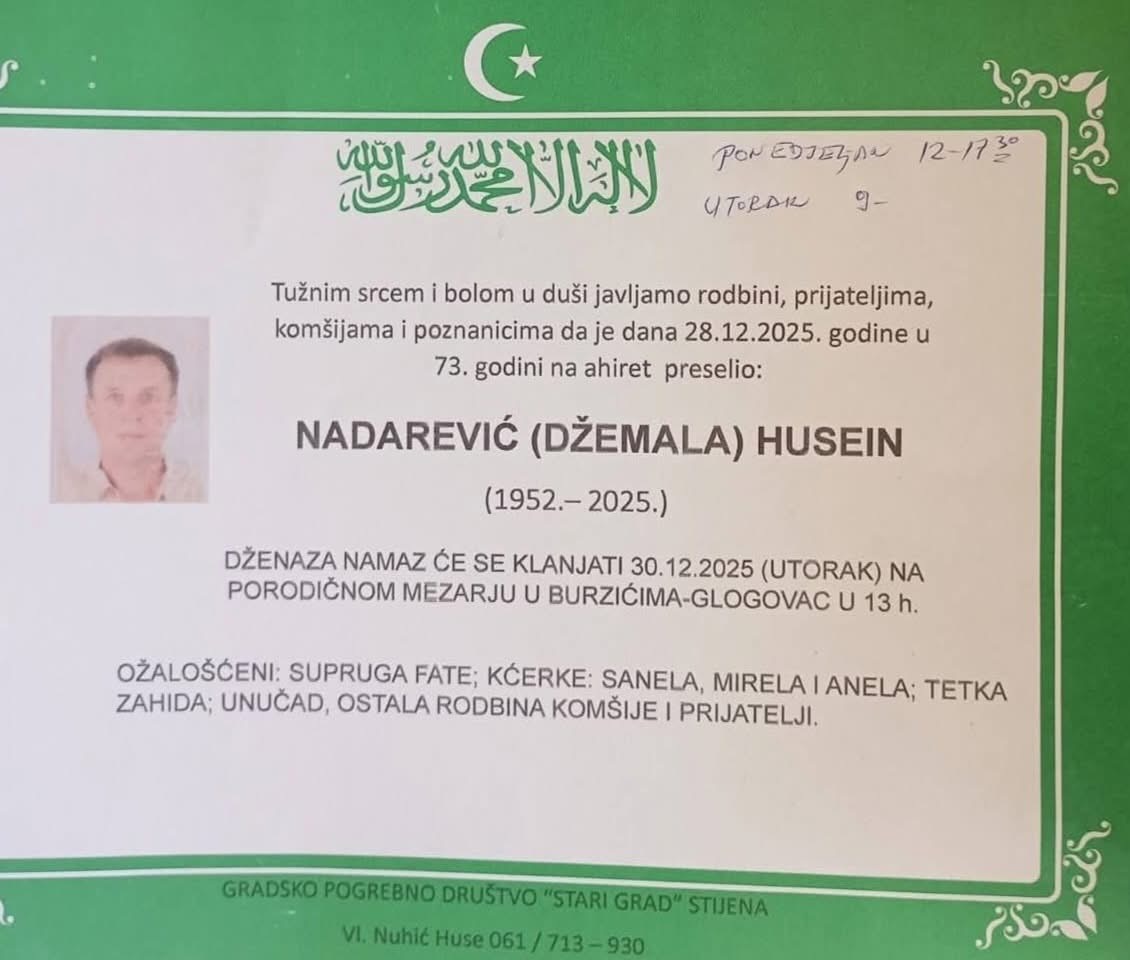 Tužnim srcem i bolom u duši javljamo rodbini, prijateljima, komšijama i poznanicima da je dana 28.12.2025. godine, u 73. godini, na ahiret preselio: