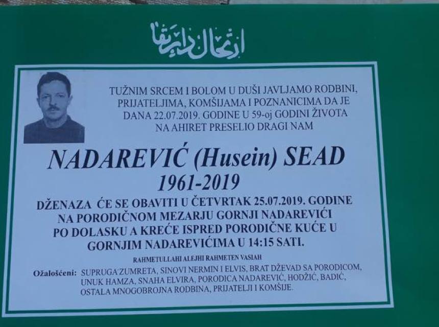 Dženaza će se obaviti u četvrtak 25.07.2019. godine na porodičnom mezarju Gornji Nadarevići po dolasku a kreće ispred porodične kuće u Gornjim Nadarevićima u 14:15 minuta.