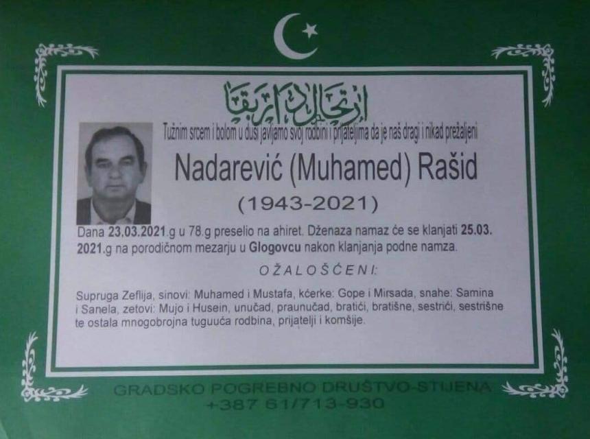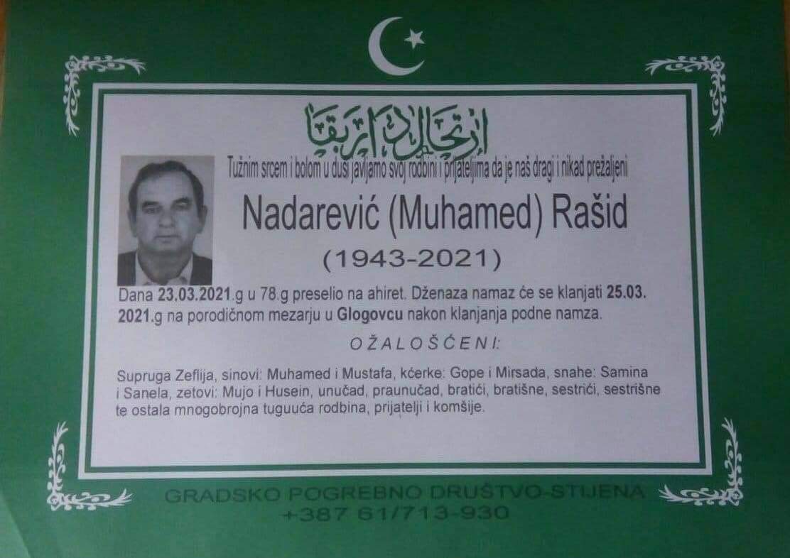 Tužnog srca i s bolom u duši obavještavamo rodbinu, komšije i prijatelje da je naš dragi Nadarević (Muhamed) Rašid, dana 23.03.2021 godine, u 78-oj godini života, preselio na Ahiret.