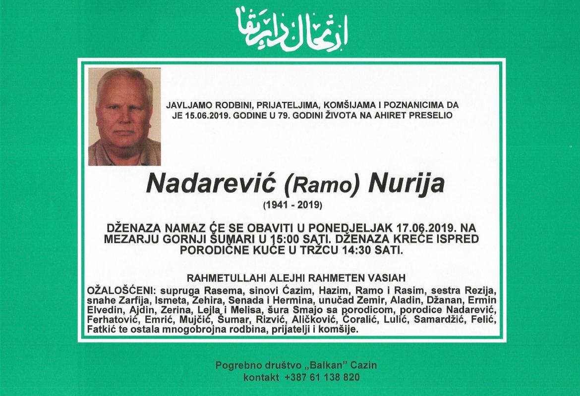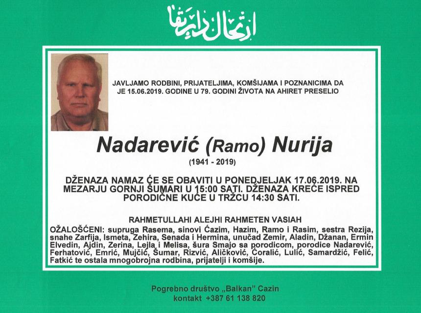 Tužnim srcem i bolom u duši javljamo rodbini, prijateljima, komšijama i poznanicima da je dana 15.06.2019. u 79.oj godini života preselio na Ahiret naš dragi Nadarević (Ramo) Nurija.
