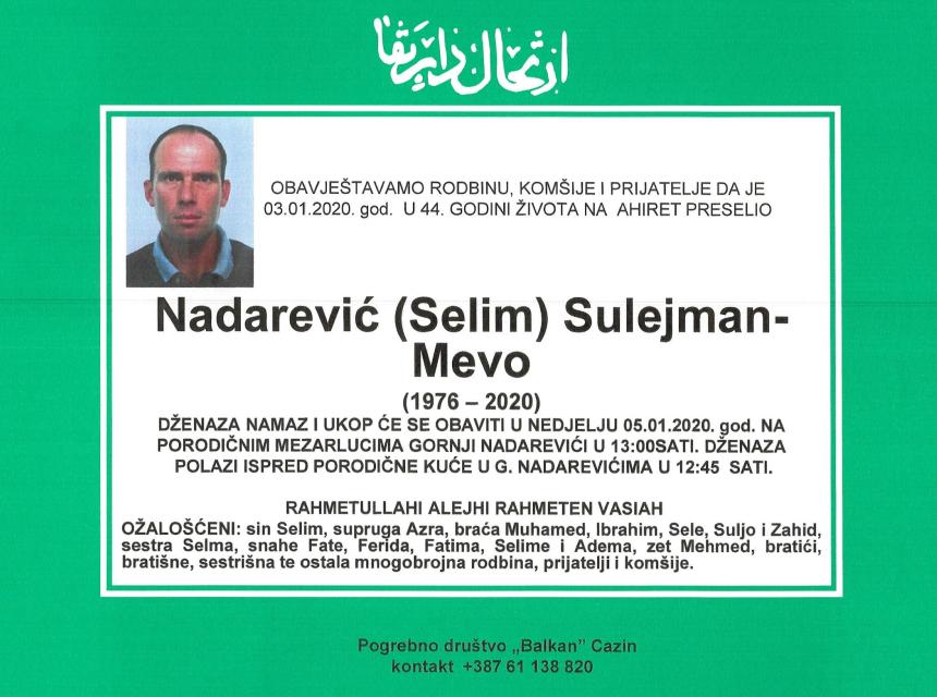 Obavještavamo rodbinu, komšije i prijatelje da je 03.01.2020.god. u 44-oj godini života na Ahiret preselio Nadarević (Selim) Sulejman-Mevo. Dženaza namaz i ukop će se obaviti u nedjelju 05.01.2020.god. na porodičnim mezarlucima Gornji Nadarevići u 13:00 sati, dženaza polazi ispred porodične kuće u G.Nadarevićima u 12:45 sati.
