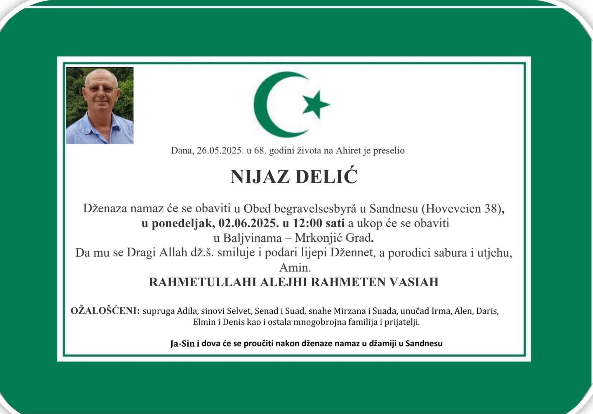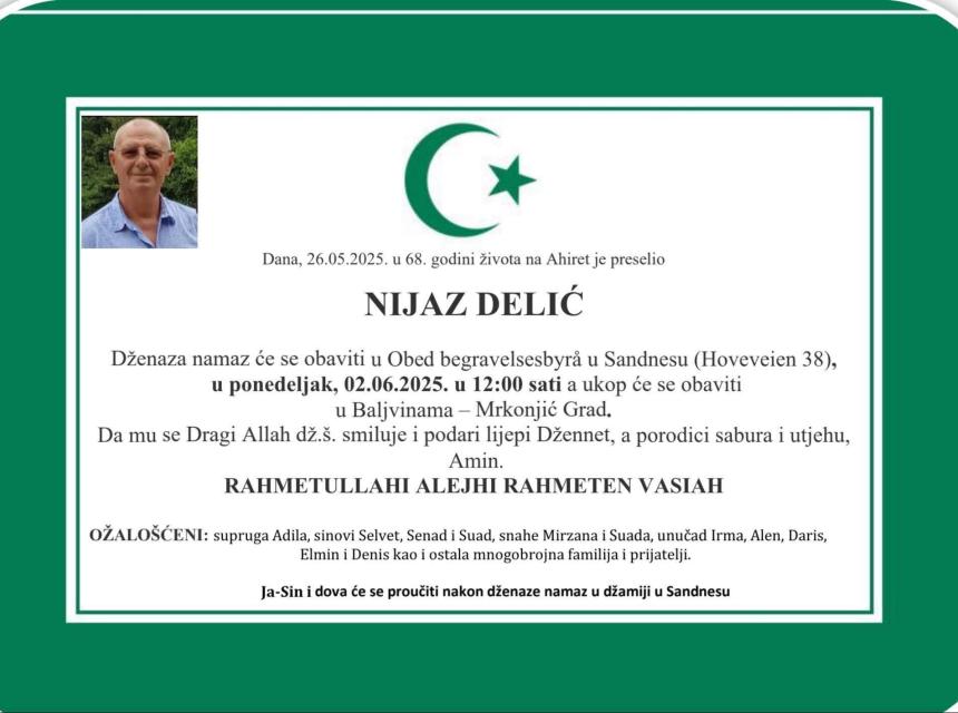 Dženaza namaz će se obaviti u Obed begravelsesbyrå u Sandnesu (Hoveveien 38),