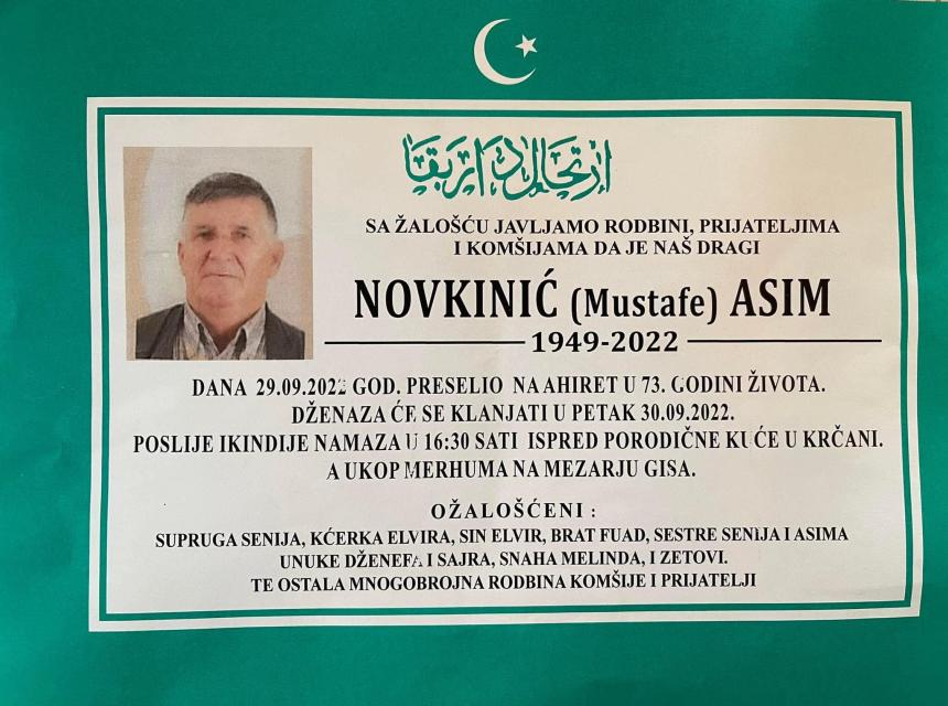 Tužnog srca i s bolom u duši obavještavamo rodbinu, komšije i prijatelje da je naš dragi Novkinić (Mustafe) Asim, dana 29.09.2022. godine, u 73-oj godini života, preselio na Ahiret.