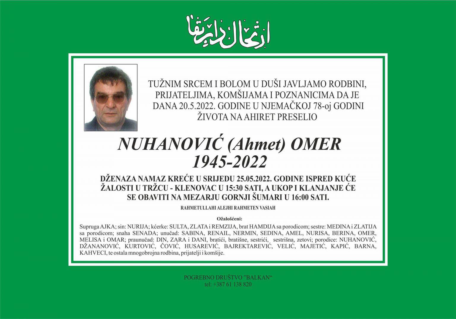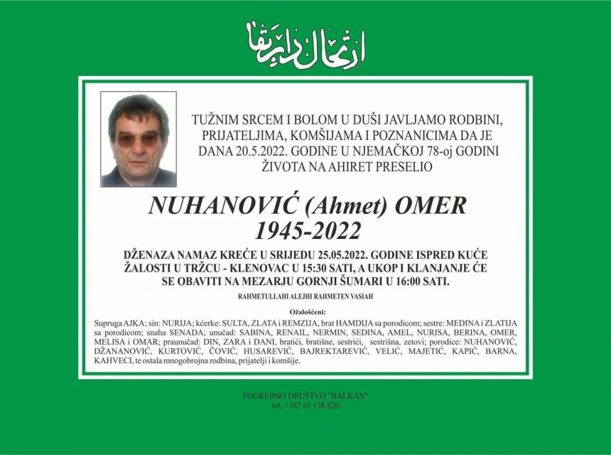 Tužnog srca i s bolom u duši obavještavamo rodbinu, komšije i prijatelje da je naš dragi Nuhanović (Ahmet) Omer u 78. godini života preselio na Ahiret.