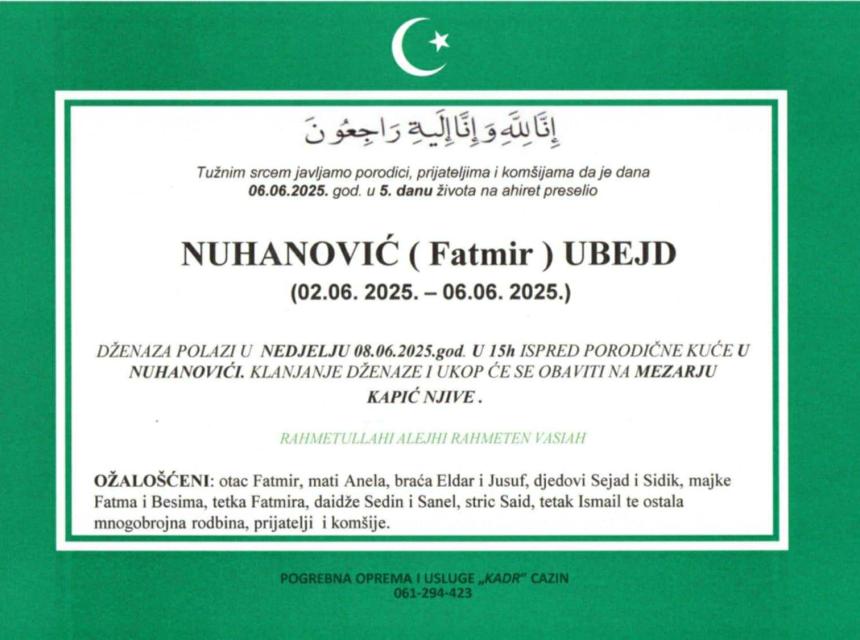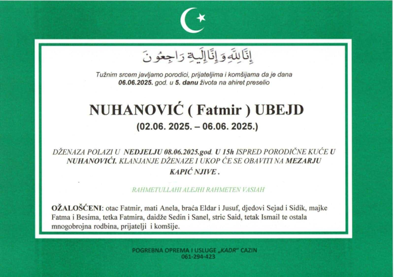 Tužnim srcem javljamo rodbini, prijateljima i poznanicima da je dana 06.06.2025. godine u 5. danu života, na ahiret preselio Nuhanović (Fatmir) Ubejd.