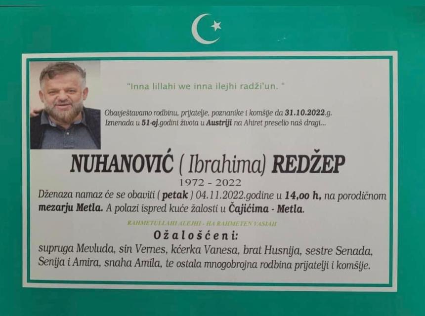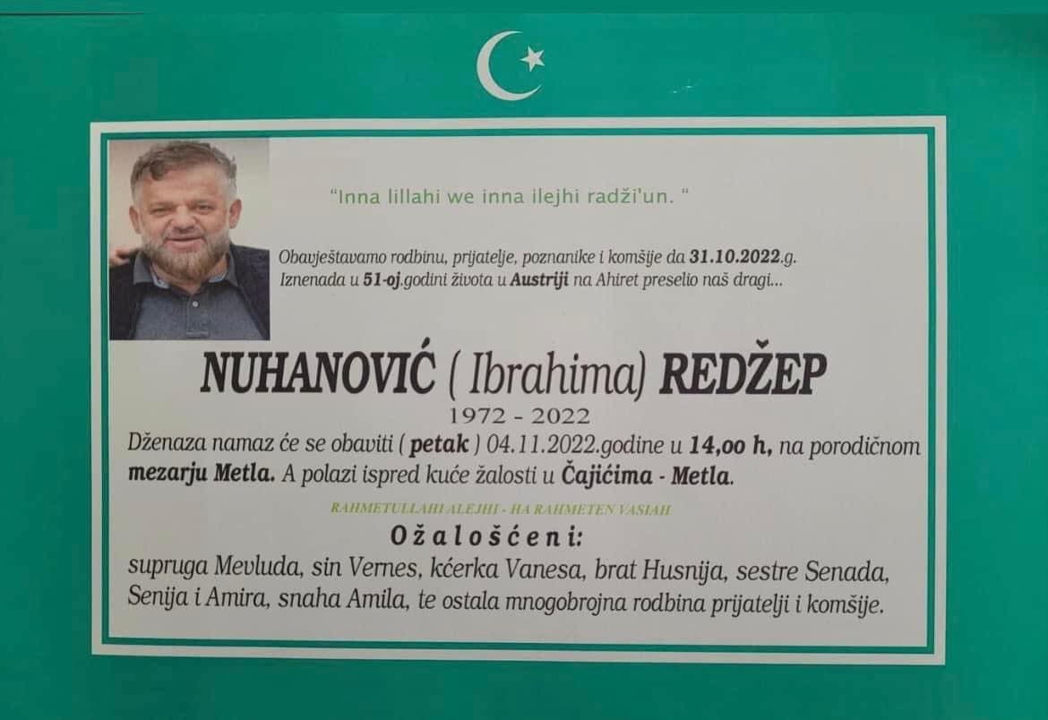 Tužnog srca i s bolom u duši obavještavamo rodbinu, komšije i prijatelje da je naš dragi Nuhanović (Ibrahima) Redžep u 51. godini života preselio na Ahiret.