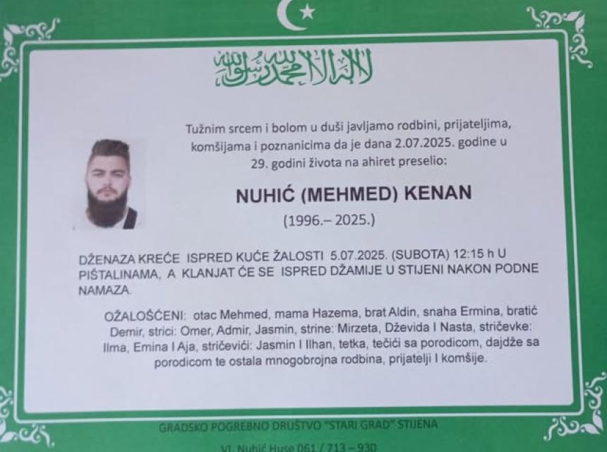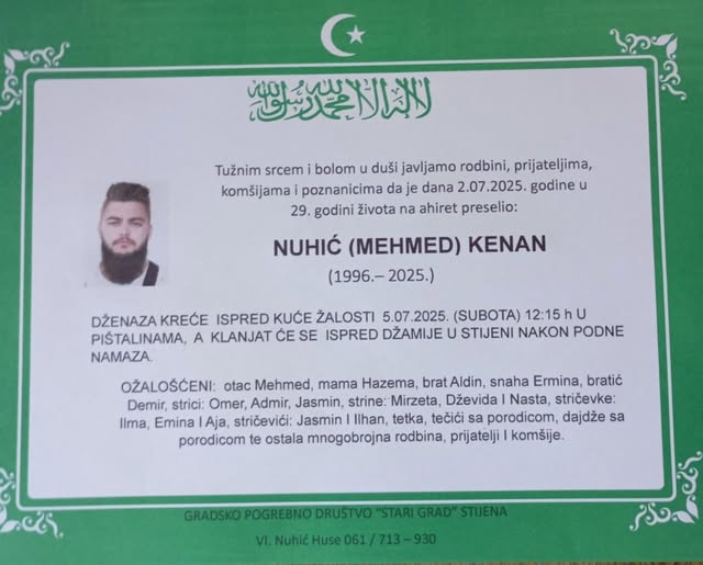 Dženaza namaz kreće 05.07.2025 (subota) ispred kuće žalosti u 12:15 sati u Pištalinama, a klanjat će se ispred džamije u Stijeni nakon podne namaza.