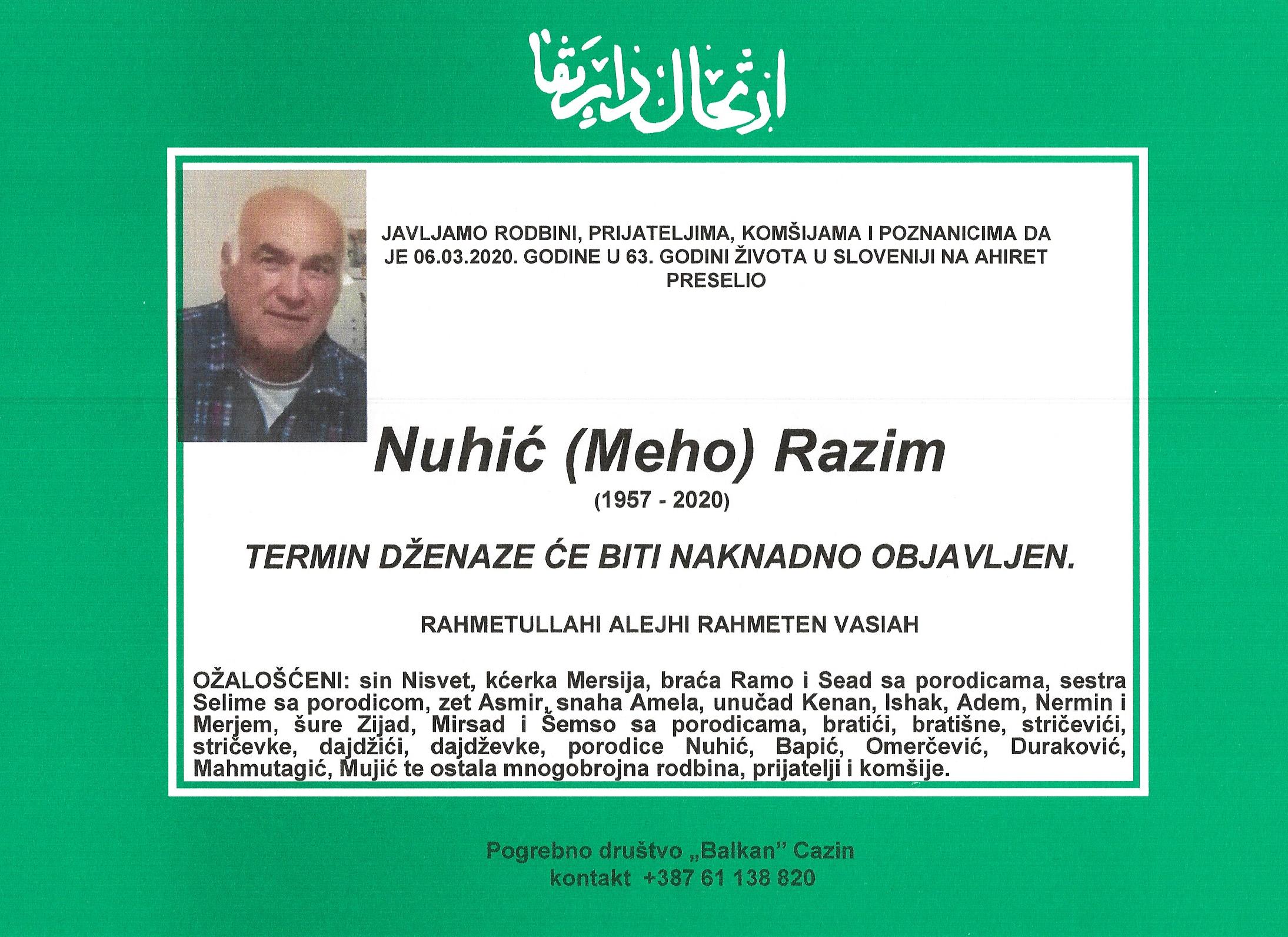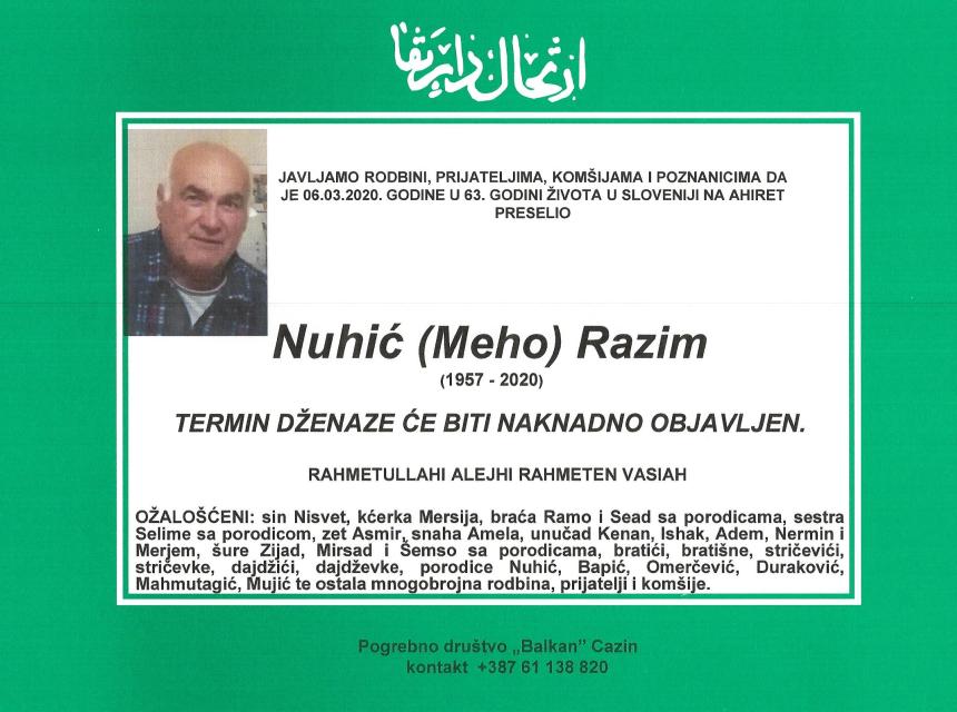 Teškim srcem i bolom u duši javljamo da je naš dragi i nikad prežaljeni Nuhić (Meho) Razim dana 06.03.2020.godine u 63. godini života u Sloveniji preselio na Ahiret.