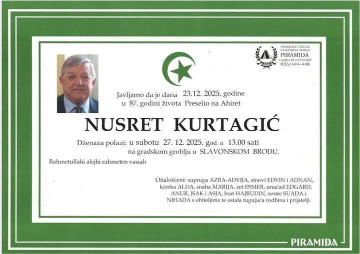 Dženaza polazi: u subotu 27.12.2025. god. u 13.00 sati na gradskom groblju u SLAVONSKOM BRODU.