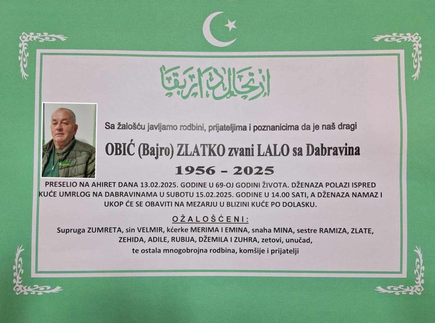 Teška srce i s bolom u dušu obavlještavamo da je preselio OBIĆ (Bajro) ZLATKO zvani LALO sa Dabravina na ahiret 13.02.2025. god. u 69. godini života.