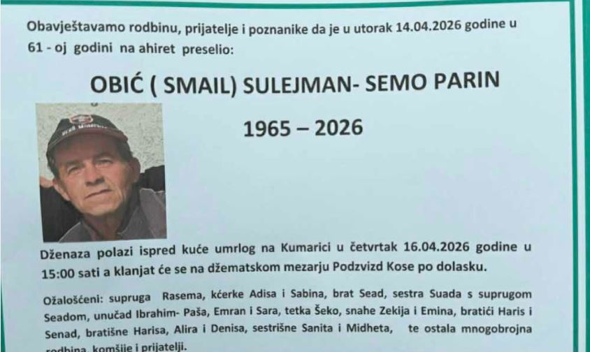 Dženaza polazi ispred kuće umrlog na Kumarici u četvrtak 16.04.2026 godine u 15:00 sati a klanjat će se na džematskom mezarju Podzvizd Kose po dolasku.