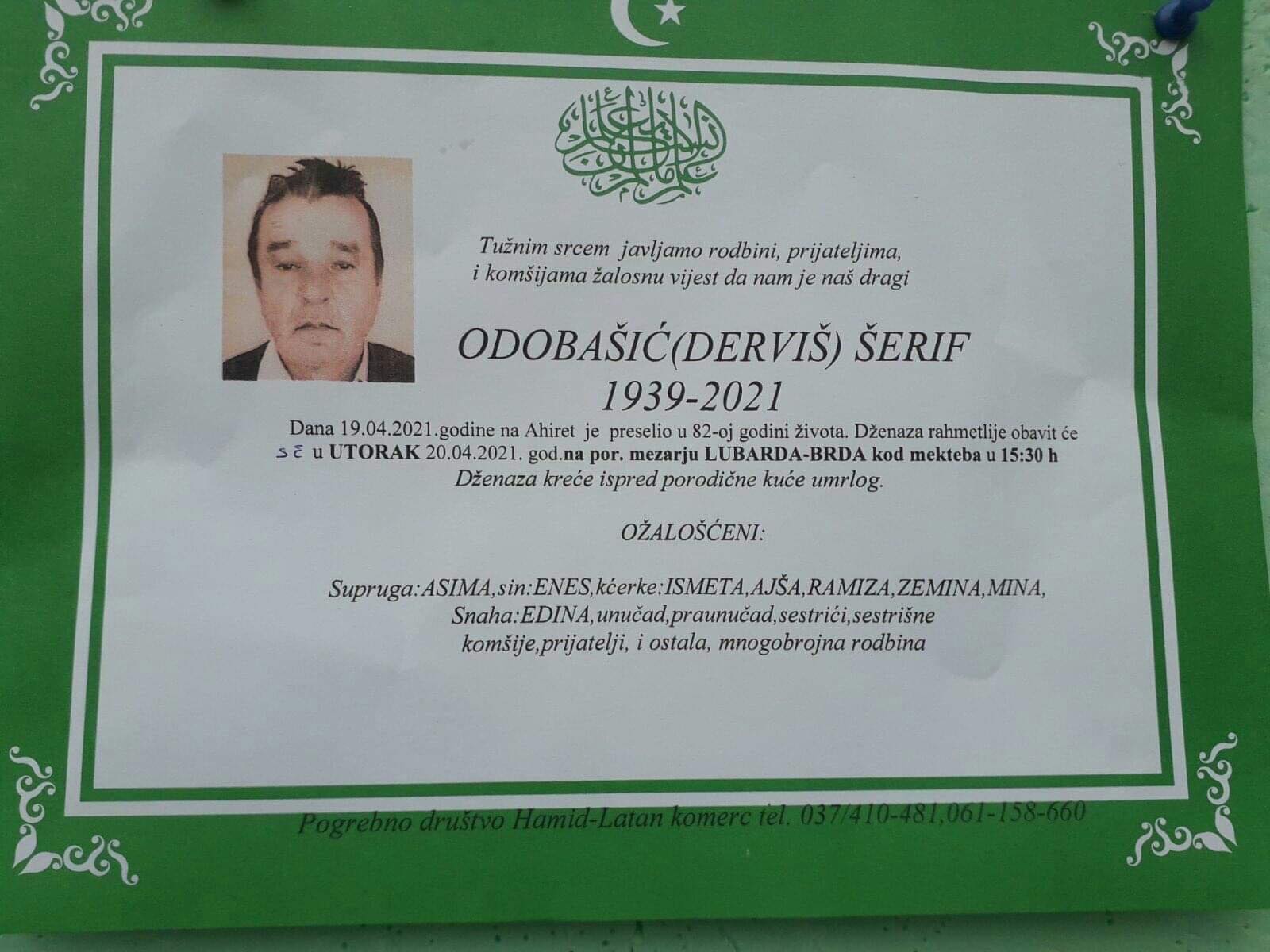 Tužnog srca i s bolom u duši obavještavamo rodbinu, komšije i prijatelje da je naš dragi Odobašić (Derviš) Šerif, 19.04.2021. godine, u 82. godini života preselio na Ahiret.