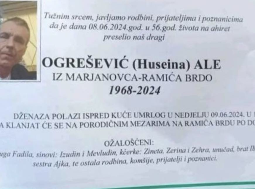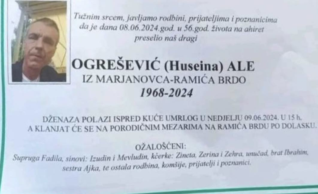 Tužnim srcem javljamo rodbini, prijateljima i komšijama žalosnu vijest da je naš dragi Ogrešević (Huseina) Ale dana 08.06.2024.g. u 56-oj godini života preselio na Ahiret.