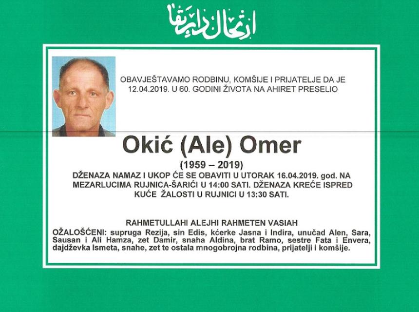 Obavještavamo rodbinu, prijatelje i komšije da je dana 12.04.2019. godine u 60. godini života na Ahiret preselio Okić (Ale) Omer.